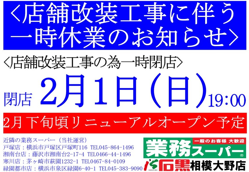 | 店名 | 業務スーパー石黒 相模大野店 |