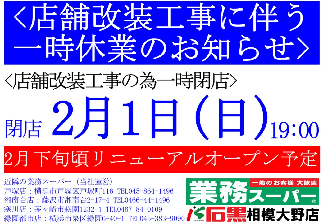 弊社運営の業務スーパー相模大野店リニューアル工事のお知らせです。